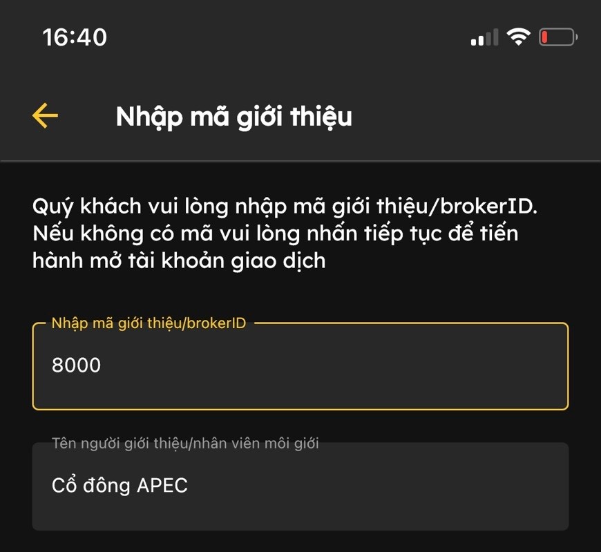 Theo thông báo của APEC, để nhận quà tặng, cổ đông tải ứng dụng đầu tư chứng khoán Apec Invest, mở tài khoản online, điền mã code “8000” vào mục Nhập mã giới thiệu và tiếp tục điền thông tin cá nhân theo hướng dẫn của APEC để tạo tài khoản.