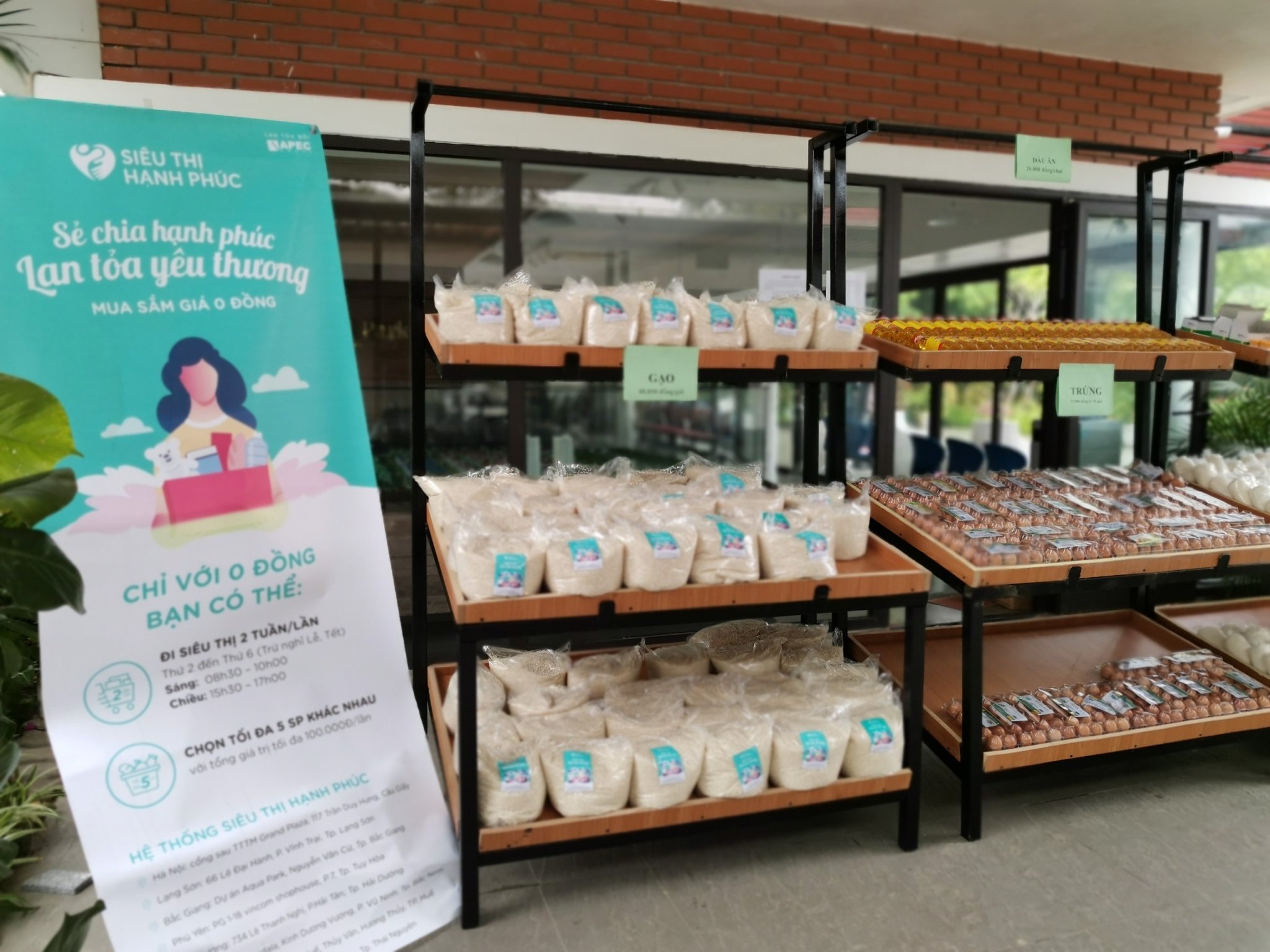 Theo đó, Apec Group đã chính thức khai trương chuỗi “Siêu thị Hạnh Phúc 0 đồng” vào sáng ngày 13/04/2020 tại 8 điểm trên 8 tỉnh thành phố (Hà Nội, Lạng Sơn, Bắc Giang, Bắc Ninh, Hải Dương, Thái Nguyên, Huế, Phú Yên) cung cấp hoàn toàn miễn phí lương thực, thực phẩm, nhu yếu phẩm, quần áo, sách… cho những người có hoàn cảnh khó khăn cần sự giúp đỡ trong giai đoạn bị ảnh hưởng bởi dịch Covid-19.