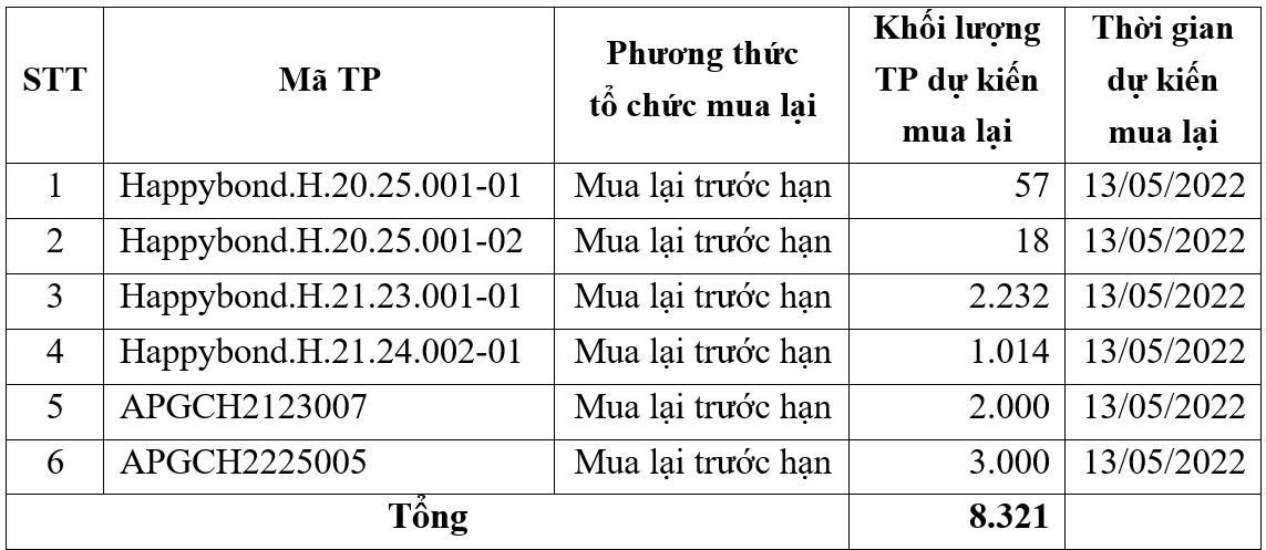 CBTT về đợt mua lại trái phiếu trước hạn Happybond tháng 05/2021
